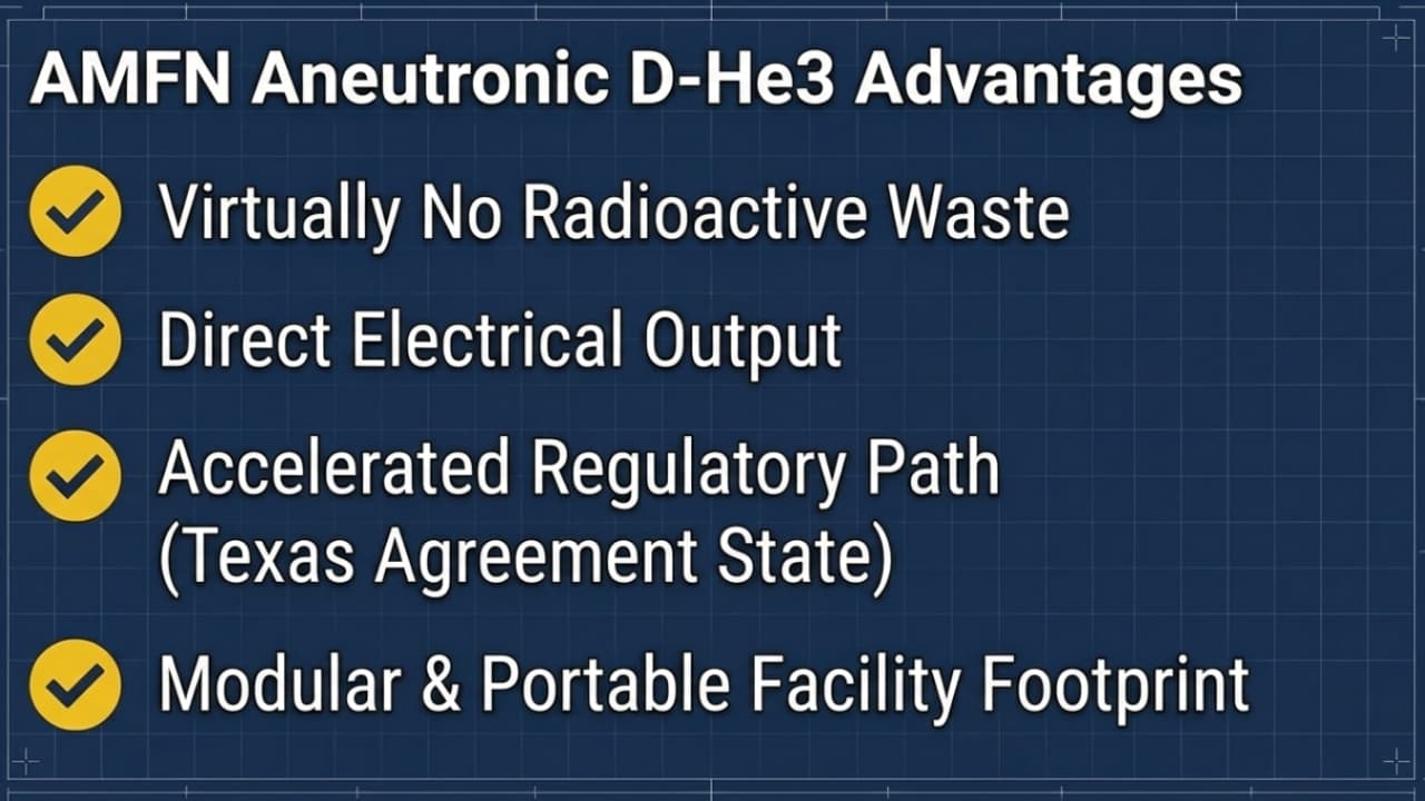 • Aneutronic D–He3 fusion → no long-term waste, almost no neutron radiation