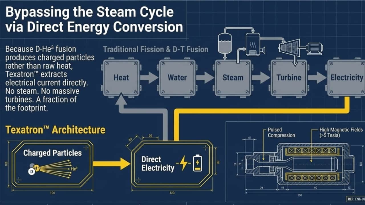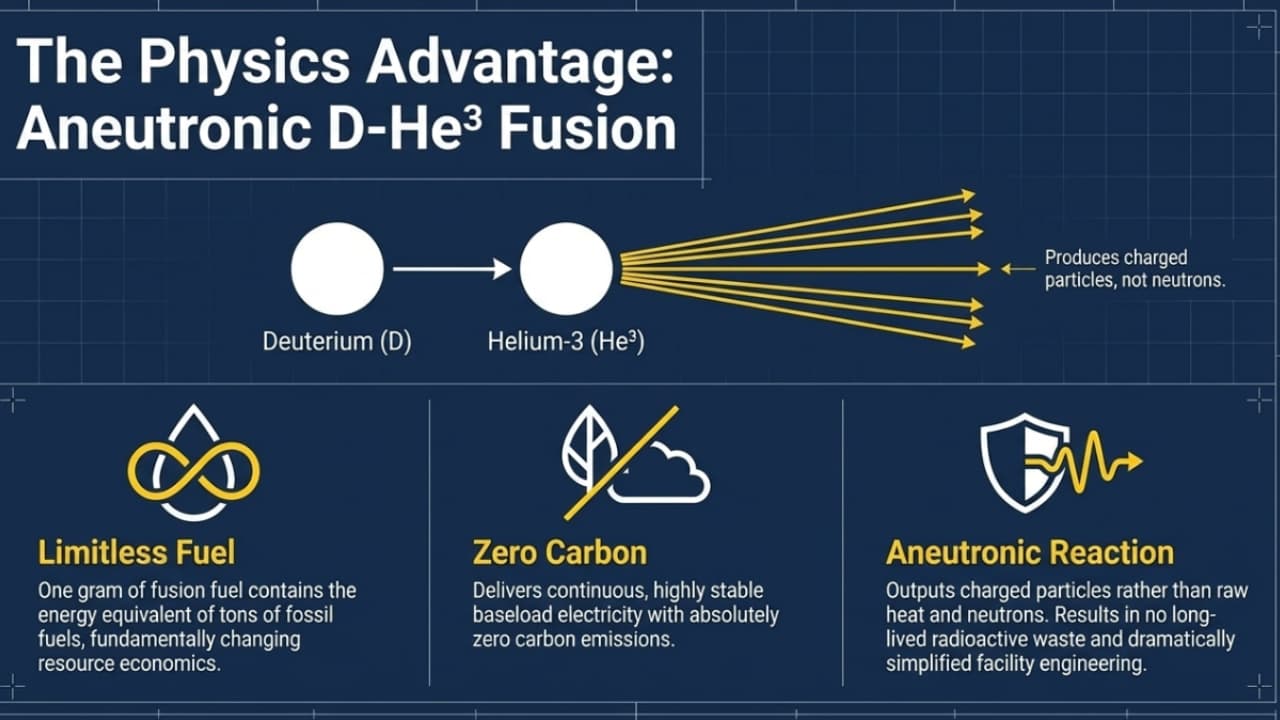 Aneutronic fusion—specifically Deuterium + Helium-3 (D–He³)—produces charged particles instead of neutrons. That allows us to convert energy directly to electricity, rather than using steam turbines.