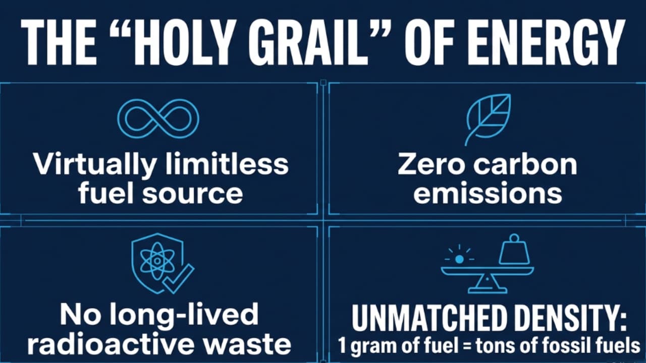 Fusion is called the holy grail because it offers what no other energy source can: virtually limitless fuel, no carbon emissions, and—if done correctly—no long-lived radioactive waste.